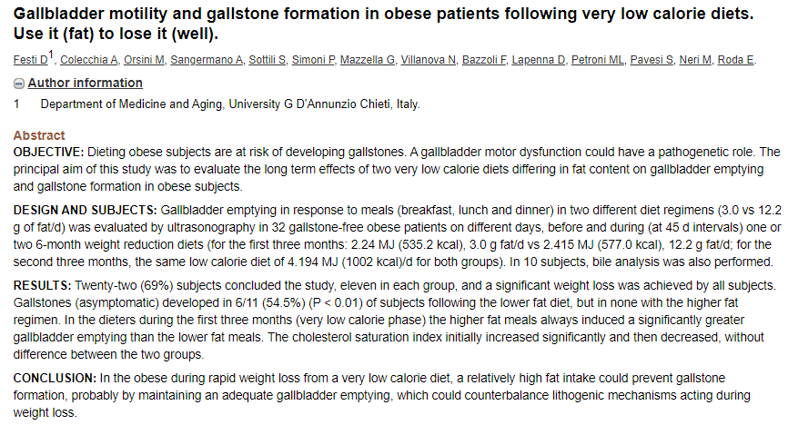 下面这个1998年的研究发现,低脂饮食增加胆结石的风险,高脂饮食减少胆结石风险。[⑤](https://www.ncbi.nlm.nih.gov/pubmed/9665682)