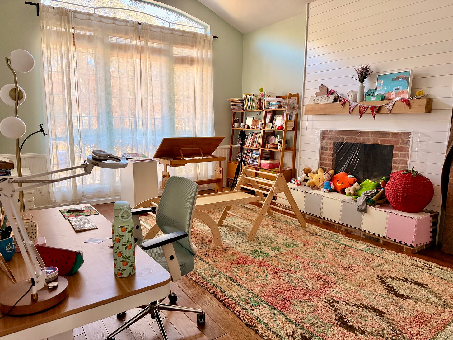And here is my current studio! We bought a 30-year-old home in the Dallas suburbs, and we are using the second living room into a studio/playroom. The space keeps evolving as Nayel grows older, with more and more of his toys taking over the room.