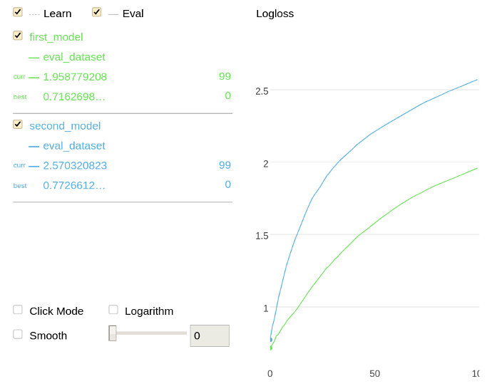 Draw train and evaluation metrics in [Jupyter Notebook](https://catboost.ai/docs/en/concepts/en/features/visualization_jupyter-notebook) for two trained models.
