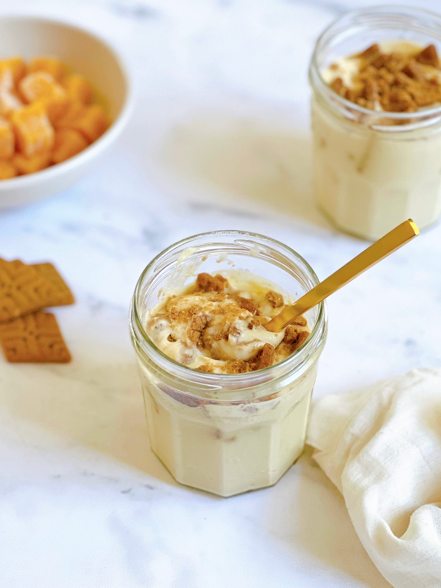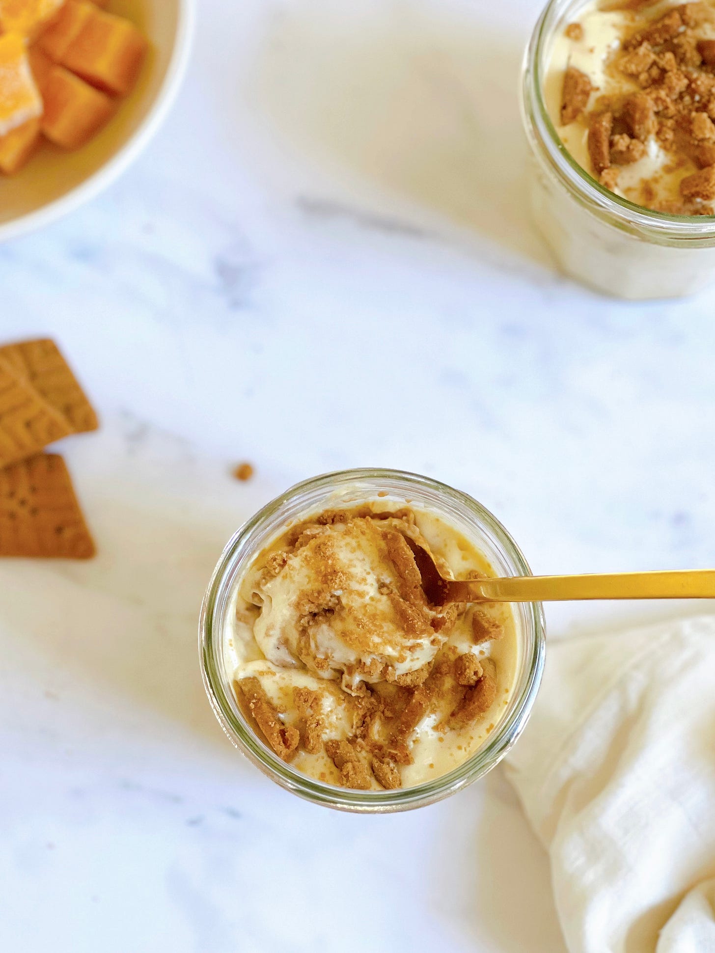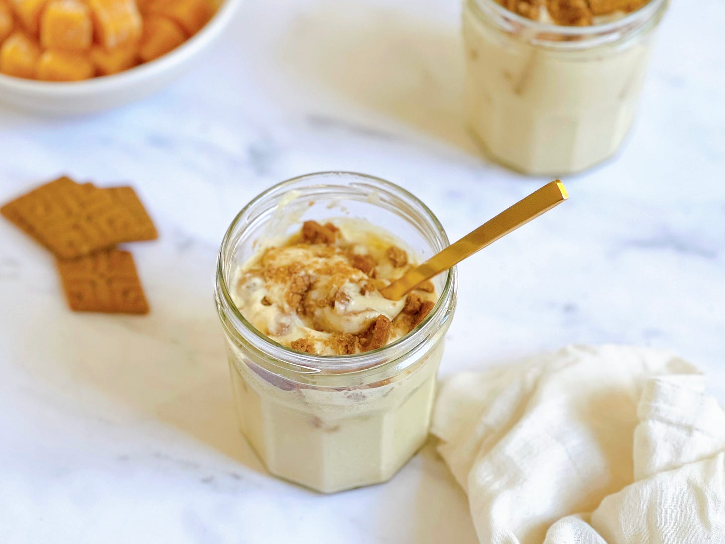 This version blends passionfruit with farmerâs cheese (for extra protein and structure), dairy-free Greek yogurt, and a little honey or maple syrup. Instead of Biscoff cookies, I use Simple Mills Lemon Sweet Thins, which soften overnight and turn the whole thing into a bright, creamy, scoopable icebox cheesecake.