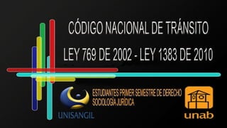 [LEY 769 DE](https://es.slideshare.net/slideshow/codigo-nacional-de-transito-de-colombia-pdf/270560249#2)2002 “POR LA CUAL SE EXPIDE EL CÓDIGO NACIONAL DE TRÁNSITO TERRESTRE Y SE DICTAN OTRAS DISPOSICIONES” La Ley 769 de 2002, rige en todo el territorio nacional por medio de la cual se adopta el Código Nacional de Tránsito Terrestre, tiene como fin regular la circulación de los peatones, usuarios, pasajeros, conductores, motociclistas, ciclistas, agentes de tránsito y vehículos por las vías públicas y ciertas vías privadas. ARTÍCULO 24 CONSTITUCIÓN NACIONAL: TODO COLOMBIANO, CON LAS LIMITACIONES QUE ESTABLEZCA LA LEY, TIENE DERECHO A CIRCULAR LIBREMENTE POR EL TERRITORIO NACIONAL, A ENTRAR Y SALIR DE ÉL, Y A PERMANECER Y RESIDENCIARSE EN COLOMBIA.
