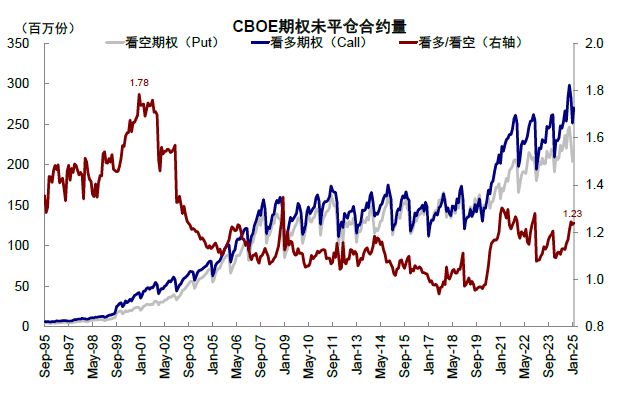 图表24:CBOE的未平仓看多期权量在2024年底增至2.8亿份的历史高位,但看多/看空比例低于2000年水平