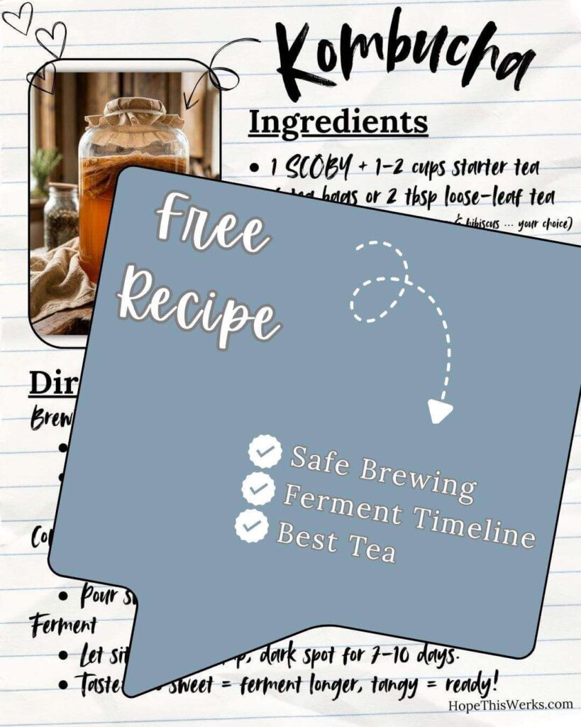 Want the quick version of this kombucha recipe without scrolling through the whole post again? [Download the FREE cheat sheet here](https://hopethiswerks.kit.com/31acf4fbc4) and keep it handy in your kitchen.
