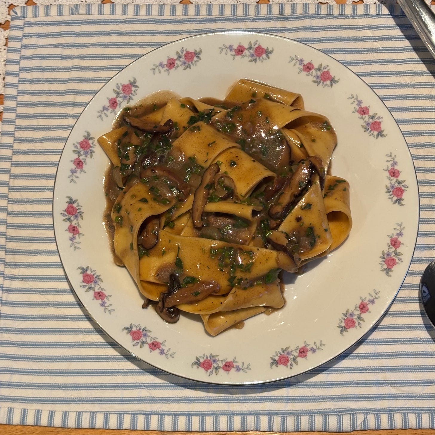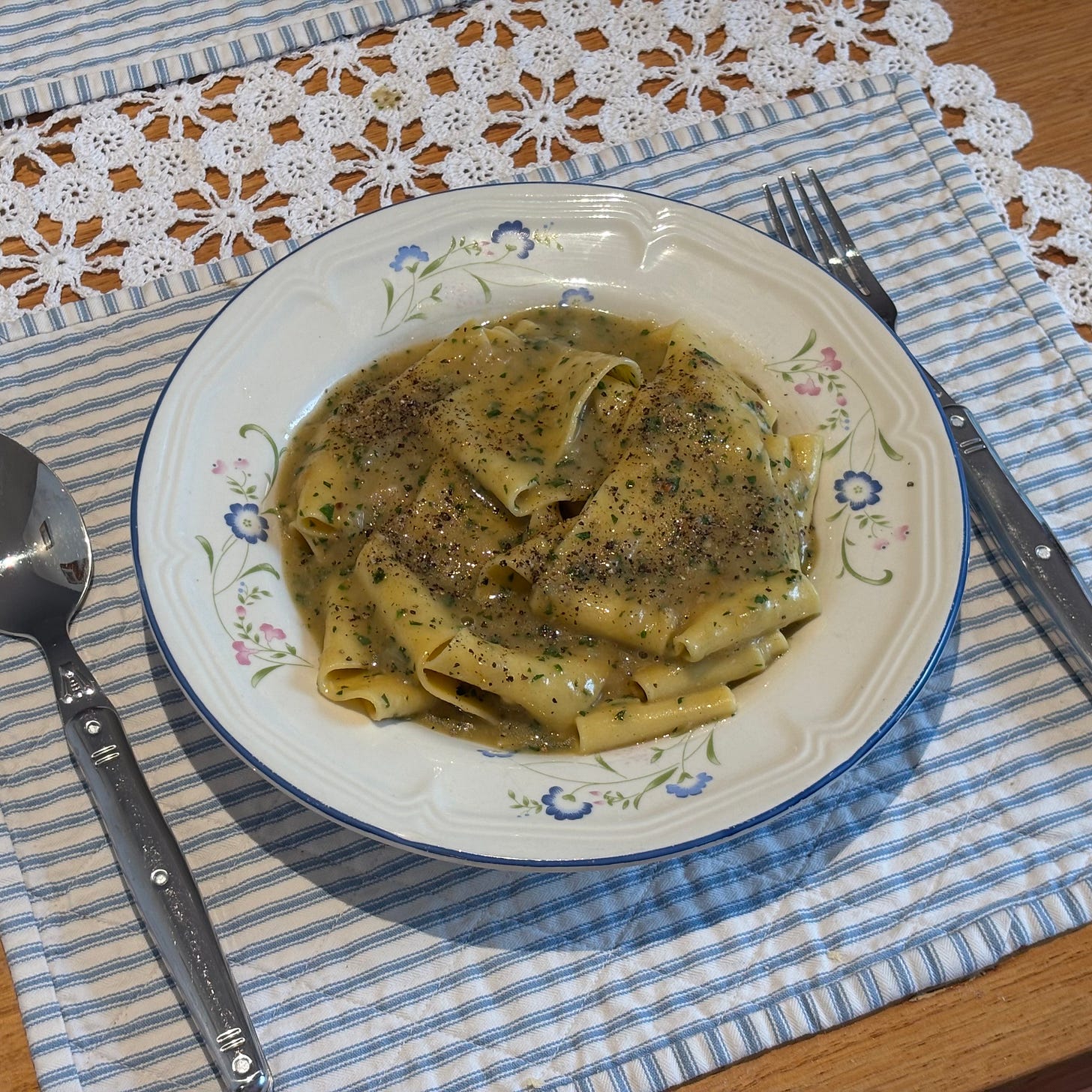 | Boilerpipe Text | I have been in a big pasta mood lately! Either with cream, tomato sauce, a bit of both or simply this beef broth base, Iām loving the routine of making the pasta and sauce as a means to wind down at the end of the day. An intentional getting off the phone, putting on a playlist, cracking open a bottle of wine and rolling out my own dough always brings me back from wherever the day took me. A particularly whimsical way of preparing pasta for dinner is to make it with