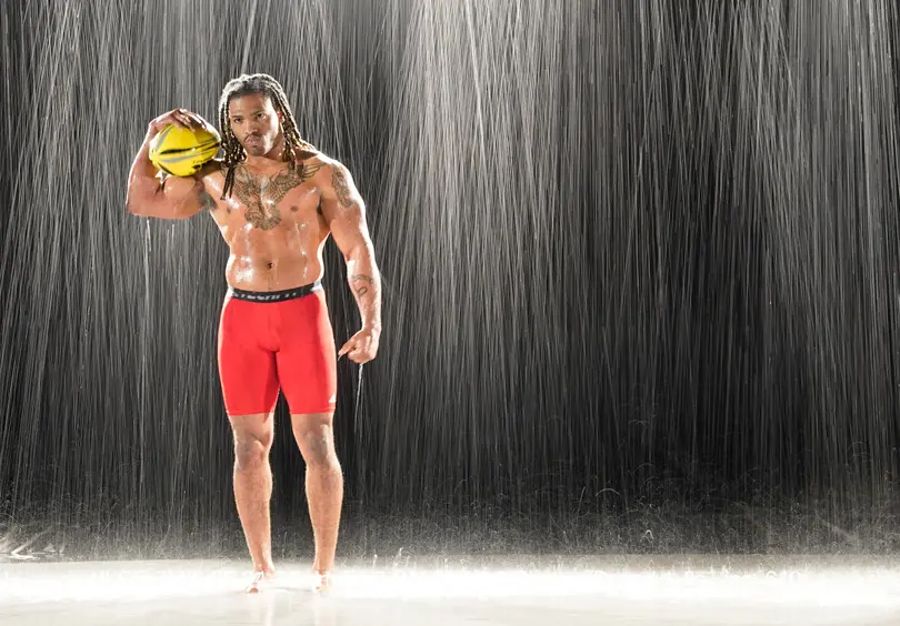 We arrived for our second shoot at the studio and we were presented with a very cool waterfall set. There were a number of very good looking models that were athletic. What more could a photographer ask for? I played around with high shutter speeds, different f/stops, dragging the shutter, and shortening exposure to increase the length of raindrops and the effect of hitting the models.