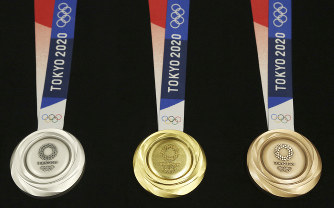 In this July 24, 2019 file photo, Tokyo 2020 Olympic medals are unveiled during a One Year to Go Olympic ceremony event in Tokyo. (AP Photo/Koji Sasahara)