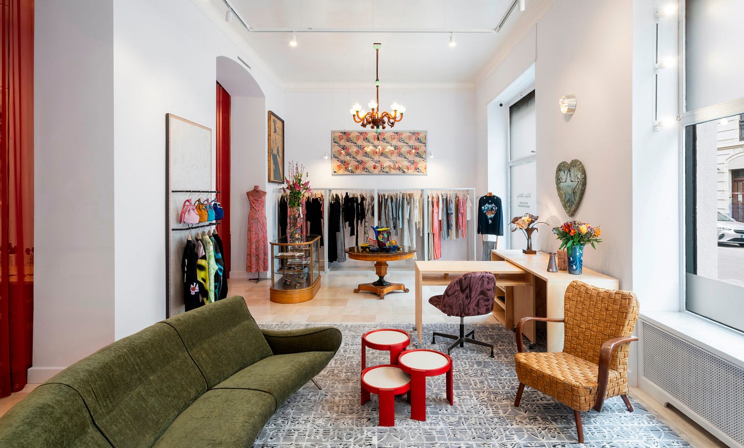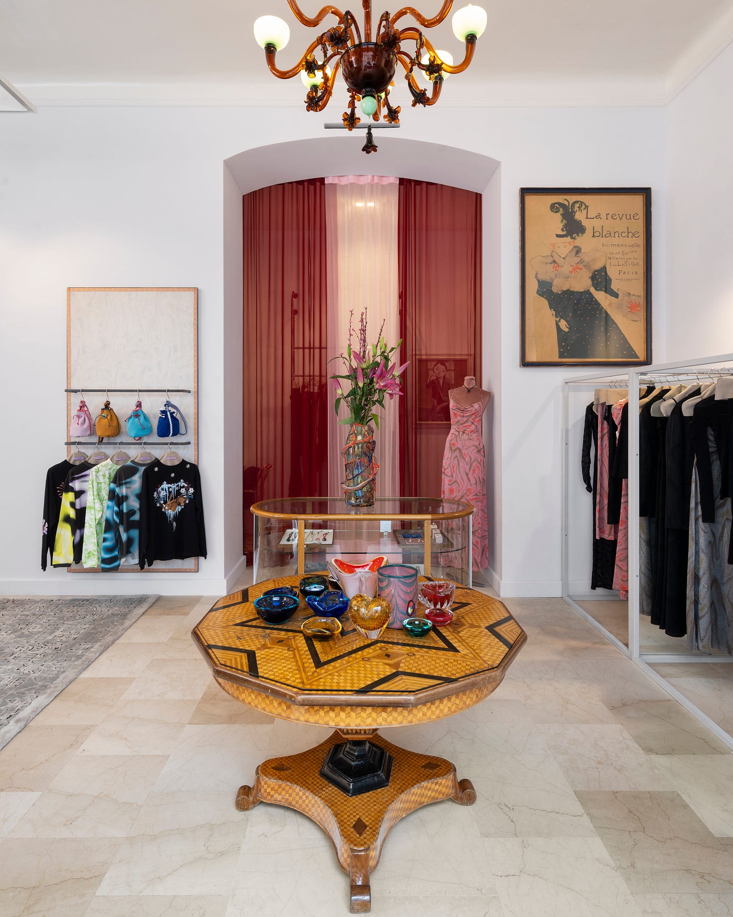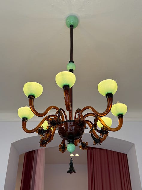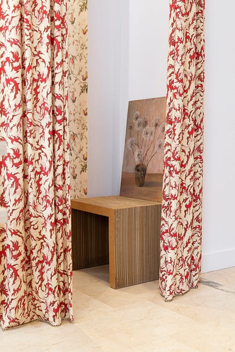 The curtains made with Maccapani stock fabrics, the shelves courtesy of a friend who took over a warehouse, my grandmotherās hand-me-downs adding an elevated layer, the Murano chandelier by [Dana Arbib](https://www.instagram.com/dana.yolanda.arbib/) as the only real purchase: we felt the need for a statement lighting element at the entrance and her designs embody a contemporary but beyond-trends aesthetic akin to Maccapani. Itās all very, very personal.