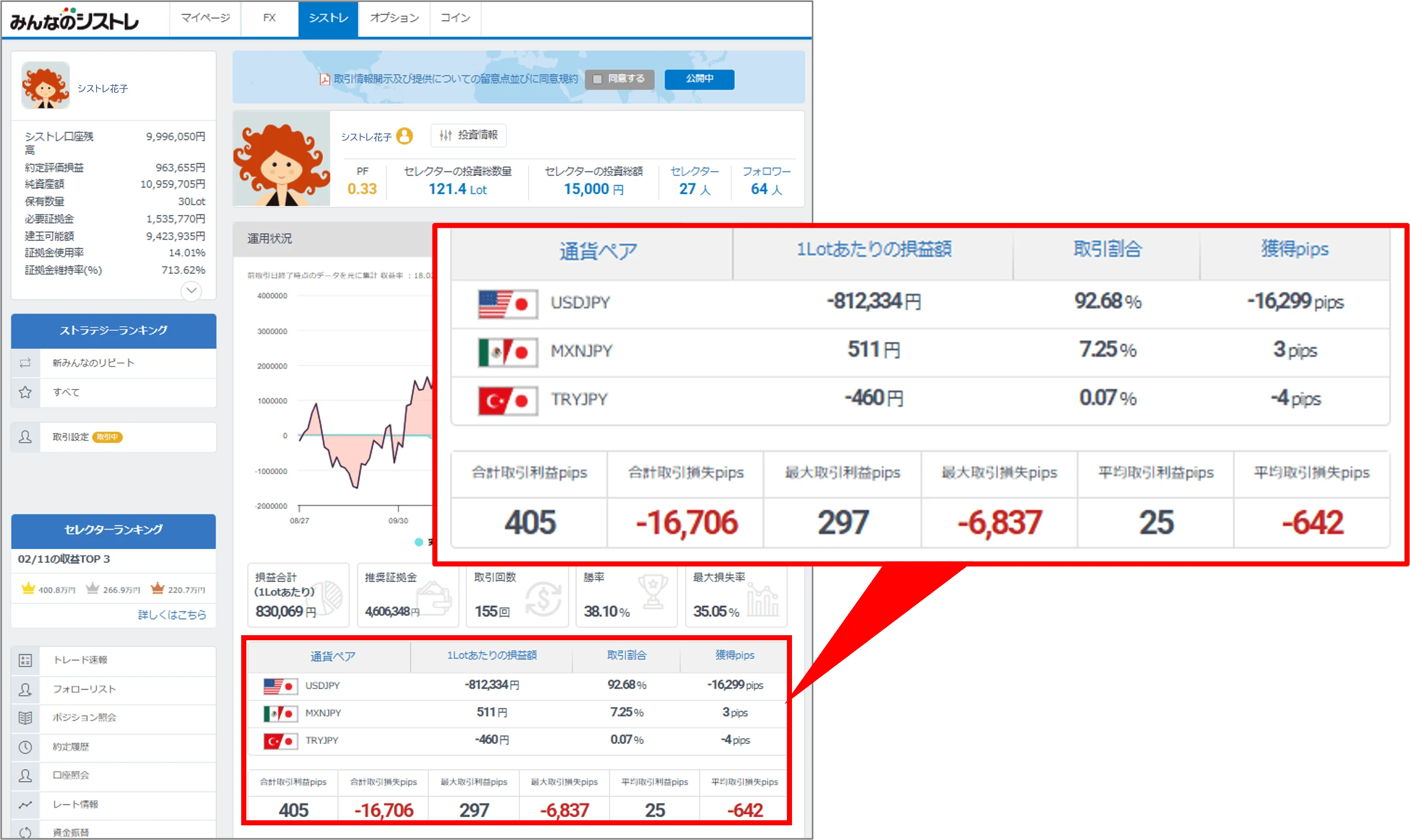 「みんなのFX」では、ご自身のFXの取引結果が一目でわかる「マイパフォーマンス」という便利なツールがありますが、「マイパフォーマンス」でも「獲得pips」や「最大取引pips」「平均取引利益pips」など、様々な項目がpipsを使って表示されています。