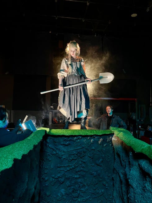 In rehearsal one day, someone was like āWhat about a Cockney accent?ā I donāt know how to do any accent properly, but I just started trying to do it. And we were all laughing, but they were like āThereās no way.ā And I was like āNo, I think weāre going to do this.ā And I just dug my heels in. I intentionally didnāt want to study an accent or be consistent because itās true to the spirit of the piece ā that there are a lot of cracks and imperfections in it. Itās more about performance and character than the illusion of realism. The other day, Ben was watching *My Fair Lady*, with Eliza Doolittle, and he was like, āOh my god, this is Gravedigger.ā And I grew up on that movie, so maybe a part of it was from that. I love a bad accent. I love a bad singing voice.
