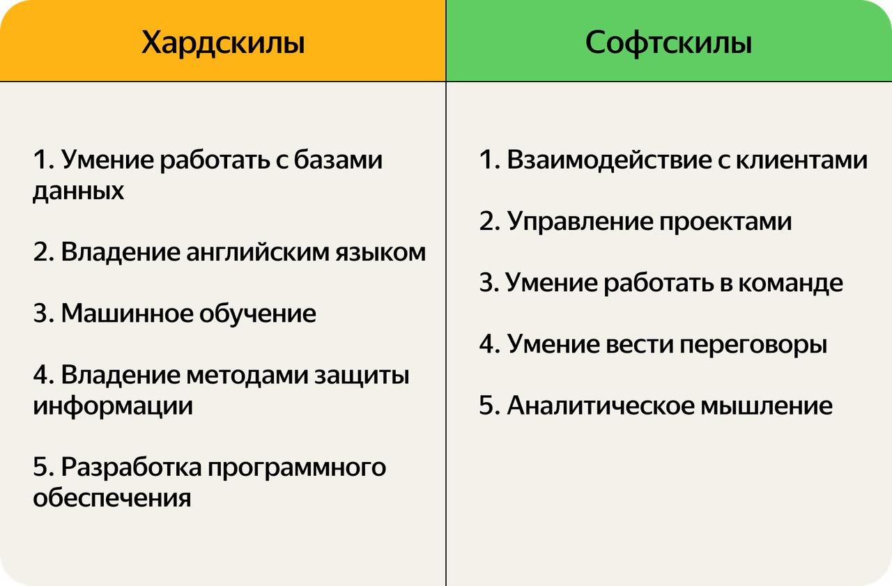 Специалистов оценивают по двум типам навыков — хард- и [софт-скилам](https://practicum.yandex.ru/blog/soft-skills/). Хардскилы, или «жесткие навыки», — профессиональные знания, инструменты, которыми владеет специалист. Софтскилы, или «мягкие навыки», — человеческие качества, которые помогают в работе.