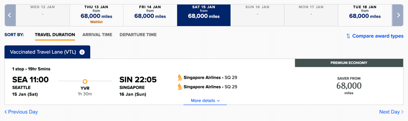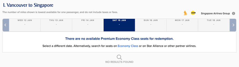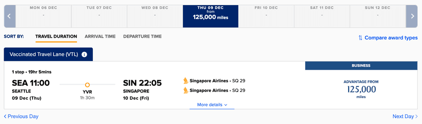 Strangely, the same flights shows no seats in any class of service when departing from Vancouver. If Singapore Airlines chooses not to release any award space on the direct route, Canadians would need to make an extra trip to Seattle or another US gateway airport to book a VTL flight to Singapore using KrisFlyer miles.