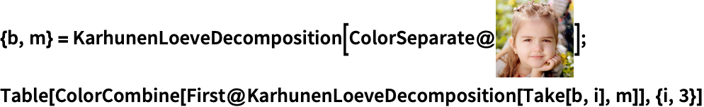 | Meta Description | KarhunenLoeveDecomposition[{a1, a2, ...}] gives the Karhunen\[Dash]Loeve transform {{b1, b2, ...}, m} of the numerical arrays {a1, a2, ...}, where m . ai == bi. KarhunenLoeveDecomposition[{b1, b2, ...}, m] uses the inverse of the matrix m for transforming bi to ai. |
