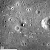 По наблюдениям Армстронга, двигатель посадочной ступени не оставил никакого кратера на поверхности, между колоколом сопла и грунтом около 0,3 м, и лунный модуль стоял на очень ровном месте. Несмотря на то, что он находился в тени лунного модуля, Армстронг, по его словам, мог ясно видеть всю поверхность «Орла» и Эдвина в иллюминаторе, отражённый свет от освещённой поверхности был достаточно ярким. С помощью конвейера для лунного оборудования, который представлял собой плоский трос с карабинами , Олдрин передал Армстронгу фотокамеру, и командир начал снимать первую лунную панораму. Хьюстон напомнил ему об аварийном образце лунного грунта (на случай, если пребывание на Луне пришлось бы в экстренном порядке прервать). Армстронг собрал его с помощью специального приспособления, похожего на небольшой сачок, и положил в мешочке в набедренный карман скафандра. Масса аварийного образца составила 1015,29 г. Он состоял из реголита и четырёх небольших камней примерно по 50 г каждый [87] .