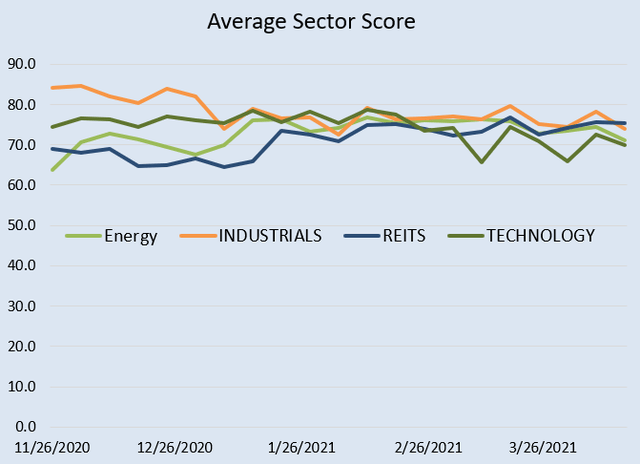 4/15/2021 4 Week MA Company Name Symbol Sector INDUSTRY SCORE SCORE FINANCIALS Wintrust Financial Corporation ([WTFC](https://seekingalpha.com/symbol/WTFC#hasComeFromMpArticle=true#source=section%3Amain_content%7Cbutton%3Abody_link)) FINANCIALS BANKS-REGIONAL 110 98\.8 Principal Financial Group, Inc. ([PFG](https://seekingalpha.com/symbol/PFG#hasComeFromMpArticle=true#source=section%3Amain_content%7Cbutton%3Abody_link)) FINANCIALS INSURANCE-DIVERSIFIED 110 86\.3 Prudential Financial, Inc. ([PRU](https://seekingalpha.com/symbol/PRU#hasComeFromMpArticle=true#source=section%3Amain_content%7Cbutton%3Abody_link)) FINANCIALS INSURANCE-LIFE 110 92\.5 Aon plc ([AON](https://seekingalpha.com/symbol/AON#hasComeFromMpArticle=true#source=section%3Amain_content%7Cbutton%3Abody_link)) FINANCIALS INSURANCE BROKERS 105 103\.8 The Bank of New York Mellon Corporation ([BK](https://seekingalpha.com/symbol/BK#hasComeFromMpArticle=true#source=section%3Amain_content%7Cbutton%3Abody_link)) FINANCIALS ASSET MANAGEMENT 100 83\.8 KeyCorp ([KEY](https://seekingalpha.com/symbol/KEY#hasComeFromMpArticle=true#source=section%3Amain_content%7Cbutton%3Abody_link)) FINANCIALS BANKS-REGIONAL 100 78\.8 M\&T Bank Corporation ([MTB](https://seekingalpha.com/symbol/MTB#hasComeFromMpArticle=true#source=section%3Amain_content%7Cbutton%3Abody_link)) FINANCIALS BANKS-REGIONAL 100 98\.8 Visa Inc. ([V](https://seekingalpha.com/symbol/V#hasComeFromMpArticle=true#source=section%3Amain_content%7Cbutton%3Abody_link)) FINANCIALS CREDIT SERVICES 100 82\.5 Intercontinental Exchange, Inc. ([ICE](https://seekingalpha.com/symbol/ICE#hasComeFromMpArticle=true#source=section%3Amain_content%7Cbutton%3Abody_link)) FINANCIALS FINANCIAL DATA & STOCK EXCHANGES 100 92\.5 Marsh & McLennan Companies, Inc. ([MMC](https://seekingalpha.com/symbol/MMC#hasComeFromMpArticle=true#source=section%3Amain_content%7Cbutton%3Abody_link)) FINANCIALS INSURANCE BROKERS 100 92\.5 American International Group, Inc. ([AIG](https://seekingalpha.com/symbol/AIG#hasComeFromMpArticle=true#source=section%3Amain_content%7Cbutton%3Abody_link)) FINANCIALS INSURANCE-DIVERSIFIED 100 76\.3 Chubb Limited ([CB](https://seekingalpha.com/symbol/CB#hasComeFromMpArticle=true#source=section%3Amain_content%7Cbutton%3Abody_link)) FINANCIALS INSURANCE-PROPERTY & CASUALTY 100 86\.3 INDUSTRIALS Carlisle Companies Incorporated ([CSL](https://seekingalpha.com/symbol/CSL#hasComeFromMpArticle=true#source=section%3Amain_content%7Cbutton%3Abody_link)) INDUSTRIALS BUILDING PRODUCTS & EQUIPMENT 105 102\.5 Compass Diversified ([CODI](https://seekingalpha.com/symbol/CODI#hasComeFromMpArticle=true#source=section%3Amain_content%7Cbutton%3Abody_link)) INDUSTRIALS CONGLOMERATES 105 88\.8 Old Dominion Freight Line, Inc. ([ODFL](https://seekingalpha.com/symbol/ODFL#hasComeFromMpArticle=true#source=section%3Amain_content%7Cbutton%3Abody_link)) INDUSTRIALS TRUCKING 105 103\.8 Northrop Grumman Corporation ([NOC](https://seekingalpha.com/symbol/NOC#hasComeFromMpArticle=true#source=section%3Amain_content%7Cbutton%3Abody_link)) INDUSTRIALS AEROSPACE & DEFENSE 100 93\.8 TransDigm Group Incorporated ([TDG](https://seekingalpha.com/symbol/TDG#hasComeFromMpArticle=true#source=section%3Amain_content%7Cbutton%3Abody_link)) INDUSTRIALS AEROSPACE & DEFENSE 100 91\.3 3M Company ([MMM](https://seekingalpha.com/symbol/MMM#hasComeFromMpArticle=true#source=section%3Amain_content%7Cbutton%3Abody_link)) INDUSTRIALS CONGLOMERATES 100 97\.5 PulteGroup, Inc. ([PHM](https://seekingalpha.com/symbol/PHM#hasComeFromMpArticle=true#source=section%3Amain_content%7Cbutton%3Abody_link)) INDUSTRIALS RESIDENTIAL CONSTRUCTION 100 87\.5 Global Payments Inc. ([GPN](https://seekingalpha.com/symbol/GPN#hasComeFromMpArticle=true#source=section%3Amain_content%7Cbutton%3Abody_link)) INDUSTRIALS SPECIALTY BUSINESS SERVICES 100 98\.8 Snap-on Incorporated ([SNA](https://seekingalpha.com/symbol/SNA#hasComeFromMpArticle=true#source=section%3Amain_content%7Cbutton%3Abody_link)) INDUSTRIALS TOOLS & ACCESSORIES 100 86\.3 Republic Services, Inc. ([RSG](https://seekingalpha.com/symbol/RSG#hasComeFromMpArticle=true#source=section%3Amain_content%7Cbutton%3Abody_link)) INDUSTRIALS WASTE MANAGEMENT 100 92\.5 Waste Management, Inc. ([WM](https://seekingalpha.com/symbol/WM#hasComeFromMpArticle=true#source=section%3Amain_content%7Cbutton%3Abody_link)) INDUSTRIALS WASTE MANAGEMENT 100 100\.0 SERVICES Genuine Parts Company ([GPC](https://seekingalpha.com/symbol/GPC#hasComeFromMpArticle=true#source=section%3Amain_content%7Cbutton%3Abody_link)) SERVICES SPECIALTY RETAIL 110 97\.5 Equifax Inc. ([EFX](https://seekingalpha.com/symbol/EFX#hasComeFromMpArticle=true#source=section%3Amain_content%7Cbutton%3Abody_link)) SERVICES CONSULTING SERVICES 105 100\.0 Service Corporation International ([SCI](https://seekingalpha.com/symbol/SCI#hasComeFromMpArticle=true#source=section%3Amain_content%7Cbutton%3Abody_link)) SERVICES PERSONAL SERVICES 105 90\.0 The Interpublic Group of Companies, Inc. ([IPG](https://seekingalpha.com/symbol/IPG#hasComeFromMpArticle=true#source=section%3Amain_content%7Cbutton%3Abody_link)) SERVICES ADVERTISING AGENCIES 100 98\.8 TransUnion ([TRU](https://seekingalpha.com/symbol/TRU#hasComeFromMpArticle=true#source=section%3Amain_content%7Cbutton%3Abody_link)) SERVICES CONSULTING SERVICES 100 80\.0 The Home Depot, Inc. ([HD](https://seekingalpha.com/symbol/HD#hasComeFromMpArticle=true#source=section%3Amain_content%7Cbutton%3Abody_link)) SERVICES HOME IMPROVEMENT RETAIL 100 100\.0 Amazon.com, Inc. ([AMZN](https://seekingalpha.com/symbol/AMZN#hasComeFromMpArticle=true#source=section%3Amain_content%7Cbutton%3Abody_link)) SERVICES INTERNET RETAIL 100 80\.0 Restaurant Brands International Inc. ([QSR](https://seekingalpha.com/symbol/QSR#hasComeFromMpArticle=true#source=section%3Amain_content%7Cbutton%3Abody_link)) SERVICES RESTAURANTS 100 93\.8 Yum! Brands, Inc. ([YUM](https://seekingalpha.com/symbol/YUM#hasComeFromMpArticle=true#source=section%3Amain_content%7Cbutton
