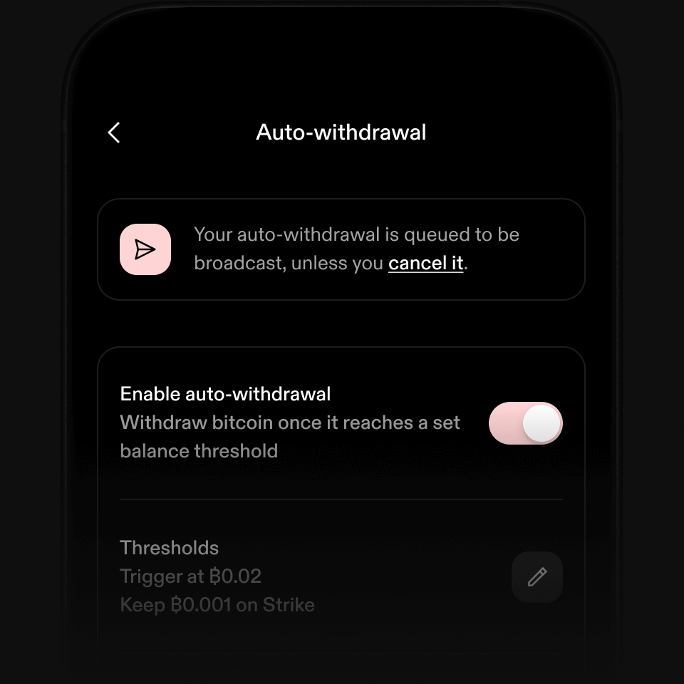 [Free on-chain withdrawals Withdraw your bitcoin to self-custody at any time. Define thresholds to trigger transfers to cold storage.  ](https://strike.me/bitcoin/)