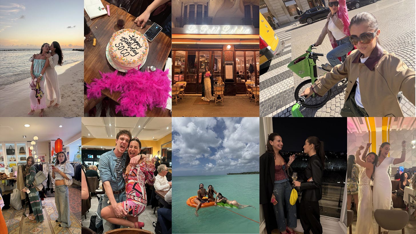 starting strong with probably the most important of them all is friendship. If there is one area of my life that I am so grateful to have dedicated so much energy to in my 20s, it is my friendships. I truly have the best people in my life from all different eras and I feel so grateful for that. I just turned 28 a couple weeks ago, such an amazing bday. I was in Paris on my actual bday and had dinner w my best friend Jess at my favorite restaurant Le Petit Lutetia. But then I did a little belated celebration in NYC with my all my besties at Bar Pitti. We literally took over the restaurant on a Tuesday night (where it happened to be 70 degrees and I whipped out a vintage pucci dress. Iconic) and there was literally so much warmth at that table, I couldnāt have felt more blessed and lucky in that moment. All of my friends come from different eras of my life - childhood, college, nyc, influencer world, etc and weāve all been through so much together, and grown through all these stages of life together, which is just so beautiful. I am so inspired by all of my friends and the journeys that we have been on together and the memories we get to create together. In this chunk of time, I also celebrated my best friend, Leaās bachelorette in the Dominican Republic. So special. I went to Paris Fashion Week and got to travel with newer industry friends, also so special. I think it is so important to not only invest in your people but to invest in experiences together too, I always leave trips like these feeling so inspired and so FULL. Memories, characters, laughs, LOVE!!!!!