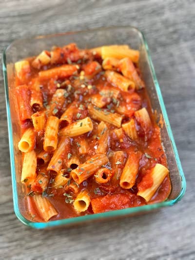 ## Hack \#7: For a no-fuss dump dinner, you can bake raw pasta in the oven — directly in its sauce.