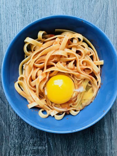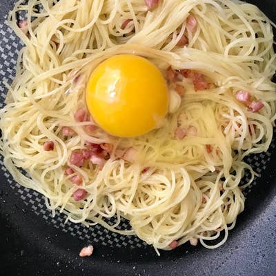 **The idea:** Spaghetti carbonara is one of life's greatest pleasures, but making it the proper ~Roman~ way takes a good amount of time and effort, and you just don't always have time for that. Which is why this [cheater's carbonara](http://indulgenteats.com/2014/05/20/spaghetti-alla-carbonara-topped-egg-yolk/) —which **gets dinner on the table in about 15 minutes flat** — is a total lifesaver. **This recipe saves time because it doesn't require you to whisk together egg yolks and Parmesan to make an egg-based sauce.** You just fry up some bacon or pancetta, add cooked spaghetti to the frying pan, crack an egg on top, and mix it all up.