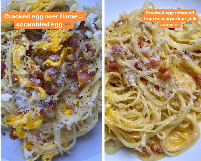 **The results:** Was this lazy gal's recipe as good as real Italian spaghetti carbonara? Maybe not. Was it good enough to whip up on a weeknight? Hell yes. It's basically a bacon, egg, and cheese sandwich in pasta form. I made this recipe twice, and the big takeaway is that in order to get the yolky, creamy sauce everyone loves about carbonara, **you have to turn the heat off the stove before cracking the egg over the pasta (or else the egg will scramble).** I turned the heat off, let the pasta sit in the frying pan for about 15 seconds, then cracked the egg and very slowly mixed the yolk into the pasta.