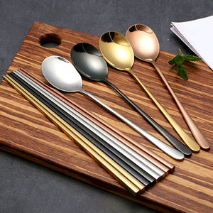 304不锈钢筷子勺子套装学生便携两件套金色方形筷家用公筷勺长柄