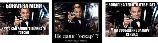 Очень уж понравился интернет-пользователям кадр с актером Леонардо Ди Каприо из фильма "Великий Гэтсби". С разными подписями эта картинка используется для иллюстрации либо цинизма, либо сарказма, либо юмора на грани фола.