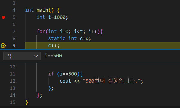 ์ด๋ฅผ ์ํด ์ค๋จ์ ์ ํน์ ์กฐ๊ฑด์์ ์คํ๋๊ฒ ํ ์ ์๋ค. ์ค๋จ์ ์์ ์ฐํด๋ฆญํ ์ค๋จ์ ํธ์ง์ ํด๋ฆญํ๋ค. ์ด๋ ์กฐ๊ฑด์ i===500์ผ๋ก ๋ฐ๊พธ๋ฉด i===500๋ถํฐ ์คํํ ์ ์๋ค. #include < iostream >