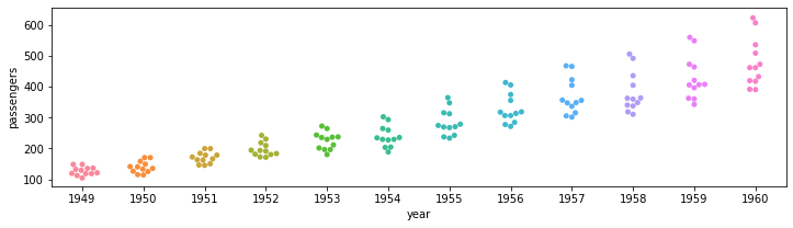 sns.swarmplot(data=flights, x="year", y="passengers")