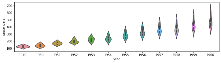 Copysns.violinplot(data=flights, x="year", y="passengers")