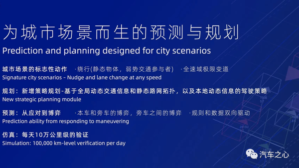 3)为城市场景设计的预测与规划算法:将地图信息与感知信息融合,理解不同车辆间的关系,可基于全局动态交通信息和静态路网结构精准导航。此外,车辆规划控制能力增强,可实现全速域极限变道与静止物体、弱势交通群体(自行车、电动车等)绕行。