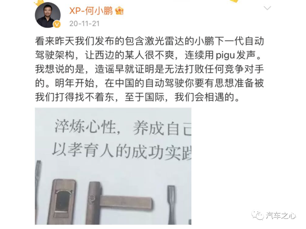 在 2020 年的 11 月,何小鹏在社交媒体上和特斯拉 CEO 马斯克展开了隔空对线,何小鹏扬言「在中国的自动驾驶你(指马斯克)要有思想准备被我们打得找不着东」。