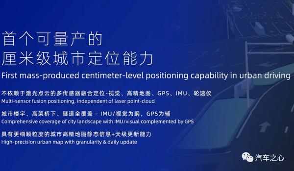 :基于视觉、高精地图、GPS、IMU、轮速仪的多传感器融合定位,城市定位精度达到厘米级。同时,具备更细颗粒度的城市高精地图静态信息+天级更新能力。