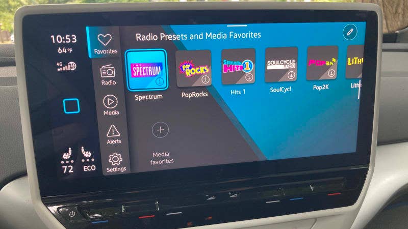 Then there’s the central touchscreen, available in 10- or 12-inch sizes with broadly the same user interface. The graphics are slick and colorful, looking every bit as futuristic as is expected for an EV and in keeping with the interior’s overall vibe. Unfortunately, it can be very slow to boot up, which is a problem when it controls so many vehicle functions. Next, although it controls complicated function well enough, something simple like changing a radio station can be infuriating. Radio presets, be it for terrestrial or Sirius satellite (pictured below left), are convoluted to select and to program, and seemingly cannot be displayed at the same time as the radio info (a big deal for satellite). We constantly drive new cars with different radio interfaces, and this is easily the most frustrating we’ve come across in many years, both in terms of learning and using thereafter. While many and perhaps most drivers play music in some way through their phones these days, radio is still a thing, and there’s no excuse for *this* nonsense.