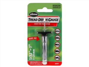 Tread depth gauges are a cost-effective tool for measuring the remaining tread depth. Theyâre usually equipped with measurements in both fractions of an inch or millimeters, whichever you prefer. A t-shaped frame has a small measuring stick like a caliper that can be extended for extremely accurate measurements, and itâs the best way to check tread on all tires, especially newer ones with plenty of depth remaining. Place the flat section against the tread, spanning two tread blocks, then press the stick downward until it presses against the tire. Read the measurement and repeat in several spots around the tire.