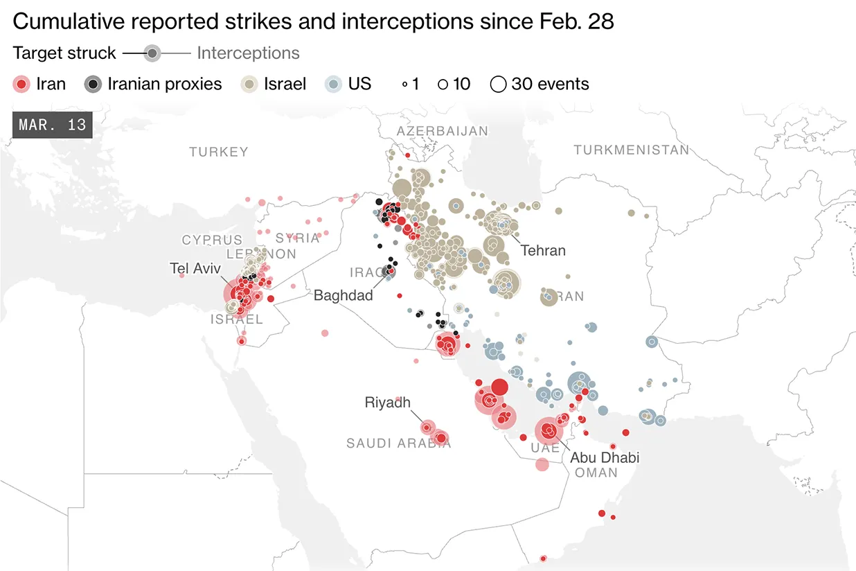 [ Middle East Conflict Strike Targets Reveal Accelerating War by Fiona MacDonald, Tom Fevrier, Raeedah Wahid, Demetrios Pogkas and Samy Adghirni](https://www.bloomberg.com/graphics/2026-iran-war-middle-east-strike-targets-map/)