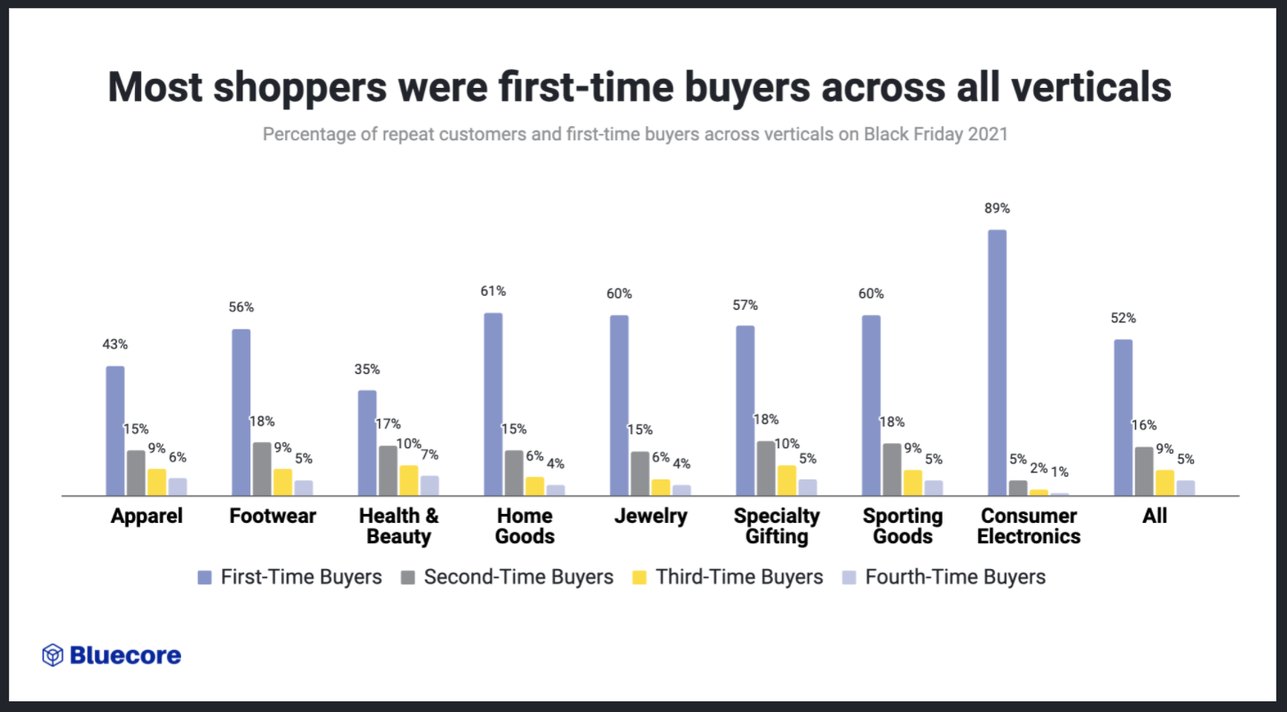 **Why is this important?** These new shoppers represent a huge opportunity for brands to [drive repeat purchases](https://www.bluecore.com/blog/ecommerce-retention-opportunity/) and increase customer lifetime value and revenue for brands. Bringing your first-time shoppers from Black Friday back to your brand could mean an [\$898K revenue opportunity](https://www.bluecore.com/resources/ecommerce-retention-opportunity/) for every 100,000 shoppers and each next purchase increases customer lifetime value for [retailers across industries](https://www.bluecore.com/resources/ecommerce-retention-data-dashboard/) from apparel to home goods.