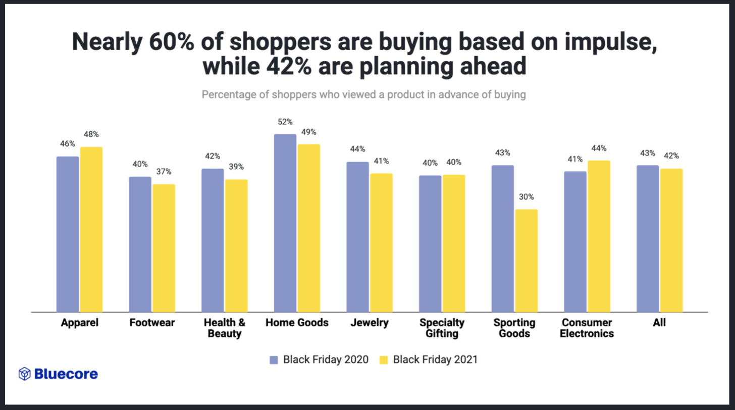 **Why is this important?** This spread of impulse vs. planned buys indicates that brands must have a marketing plan that accounts for both [impulse and planned buys](https://www.bluecore.com/blog/know-your-customers/) to capture the maximum number of purchases.