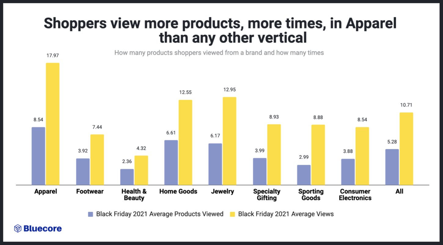 Shoppers viewed the most products the most times when shopping for Apparel (8.54 products, 17.97 times), which could indicate shoppers window shopping and browsing without a specific product in mind.