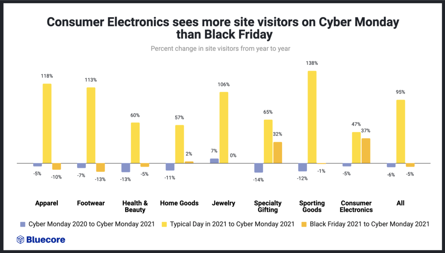 Black Friday site traffic decreased by 5% compared to Black Friday 2020 and 2021 Black Friday site traffic is on average 110% higher than on a typical day across verticals.