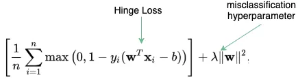 与线性回归一样,支持向量机并不经常出现在ML面试中。但是,了解 SVM 的成本函数的方程式,将有助于你理解超参数,超参数可用于控制误分类数量*(这个问题经常出现在与SVM有关的问题中)*。**如果超参数为 0,则模型不允许出现任何误分类,反之,超参数值越大,允许的误分类越多。**