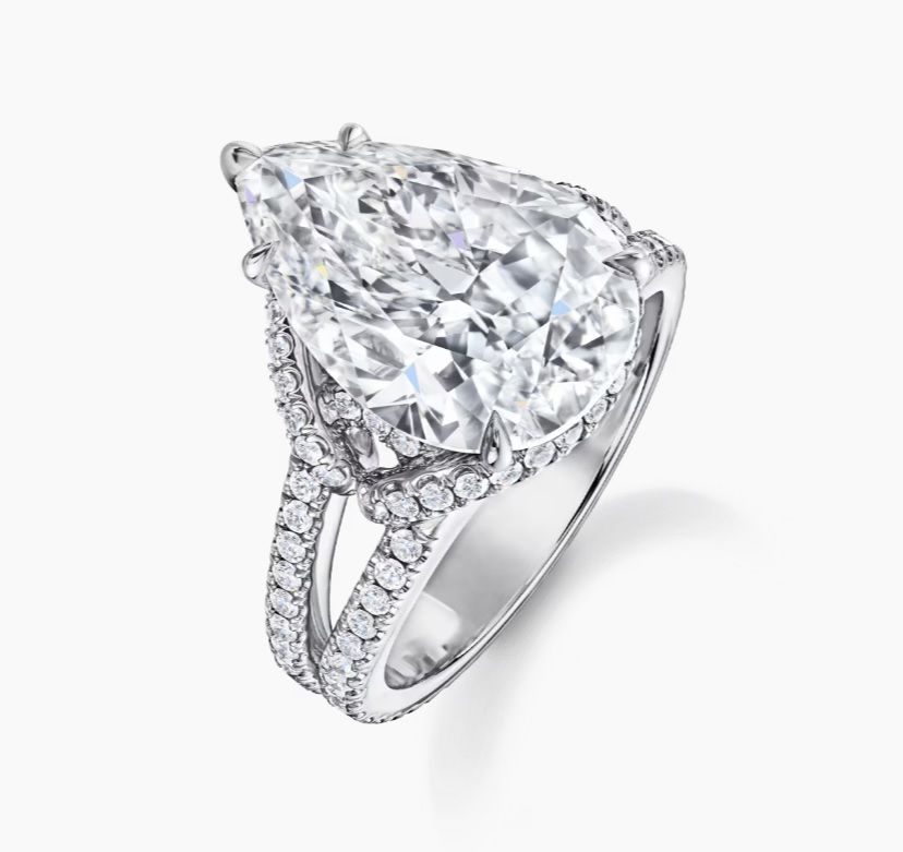 Swifties are certain to love this Bridal Couture pear-shaped diamond engagement ring from Harry Winston, featuring a 5.70 carat pear-shaped central stone draped between two interlacing