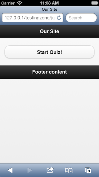 I whipped up a quick jQuery Mobile application with two pages. The first simply links over to the quiz page.