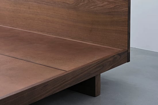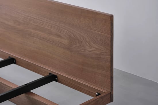 2️⃣床腳:床腳是落地的片狀,共有兩片,非常大片,而且很厚,作法是雲杉實木,頭尾夾兩塊實木塊(橡木/胡桃木)做出斷面效果,床底看不到的雲杉外面貼上超厚實木皮,這部分用到雲杉跟貼皮,老實說是為了降低成本跟售價,如果這兩片都用橡木跟胡桃木,售價會高出許多。