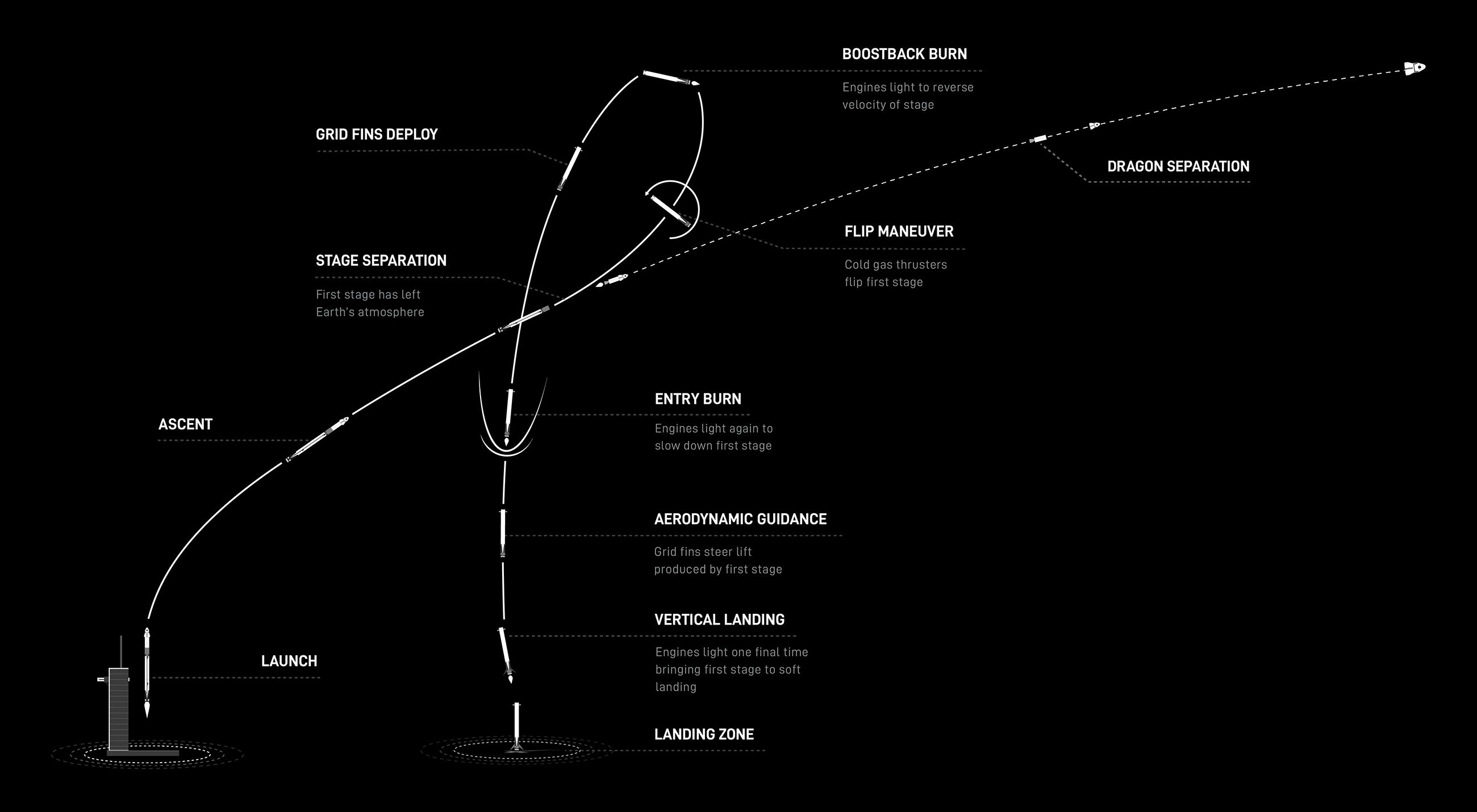 01\. Falcon 9's first stage lofts Dragon to orbit. Falcon 9's first and second stage separate. Second stage accelerates Dragon to orbital velocity.02\. Dragon separates from Falcon 9's second stage and performs initial orbit activation and checkouts of propulsion, life support, and thermal control systems.03\. Dragon performs delta-velocity orbit raising maneuvers to catch up with the International Space Station.04\. Dragon establishes a communication link with the International Space Station and performs its final orbit raising delta-velocity burn.05\. Dragon establishes relative navigation to the International Space Station and arrives along the docking axis, initiating an autonomous approach.06\. Dragon performs final approach and docks with the International Space Station, followed by pressurization, hatch open, and crew ingress. |