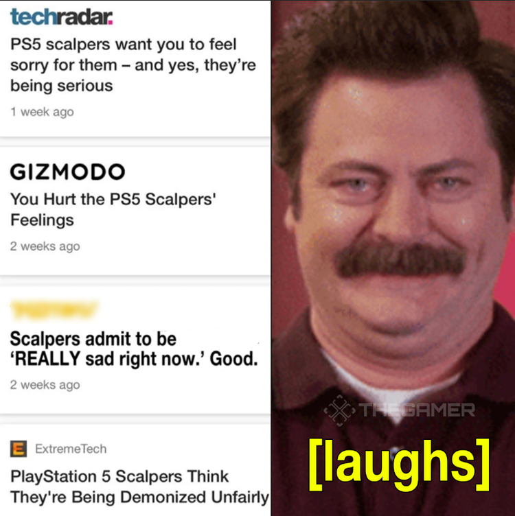 The news recently hit that the [infamous scalpers](https://www.thegamer.com/playstation-5-scalper-memes/) who have been raking in the dough from the purchase and re-selling of PlayStation 5 consoles are apparently hurt by how people are perceiving them. Please excuse us as we get out our tiny violins.
