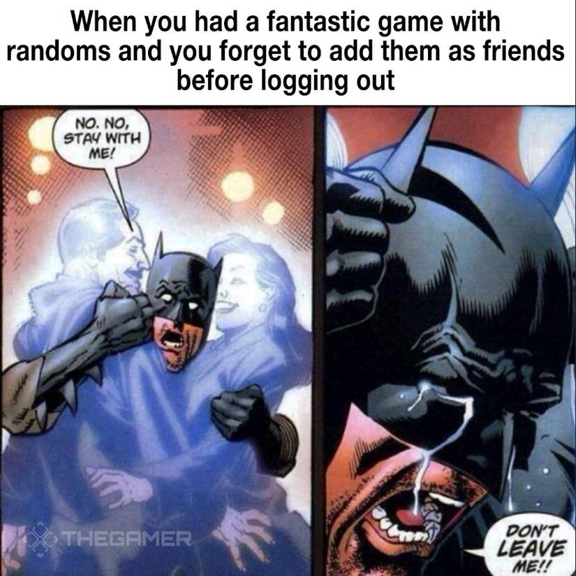 Some of the best memes are funny because of how true they are, and this meme is certainly one of those. When you meet random players via matchmaking and have an absolute blast with them, but then forget to add them as friends before they (or you) log out is always a regrettable moment. Though we doubt Batman would compare forgetting to befriend someone online to the loss of his parents, one of the most emotional and enduring plotlines of the comics, regardless, this meme is hilarious to the rest of us. 1