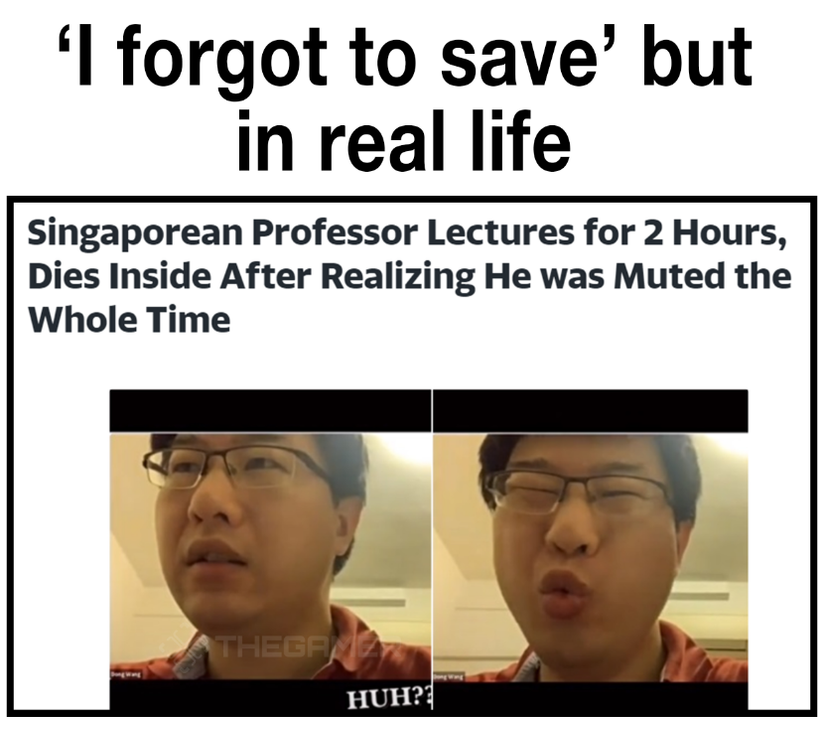 There are often times in our lives where things happen and we can't help but parallel them to situations from games. This Professor from Singapore lectured for two hours before realizing that he had been muted the entire time, if that's not the perfect example of playing for hours and forgetting to save before youĀ quit the game, then what is? RELATED:Ā Persona 5 Strikers: 10 Memes That Will Leave You Crying Of Laughter This is one of the worst things that can happen to a gamer, and you usually realize just after you hit the quit button and the sense of dread falls over you. What's more unbelievable is that none of his students pointed out his mistake. 7