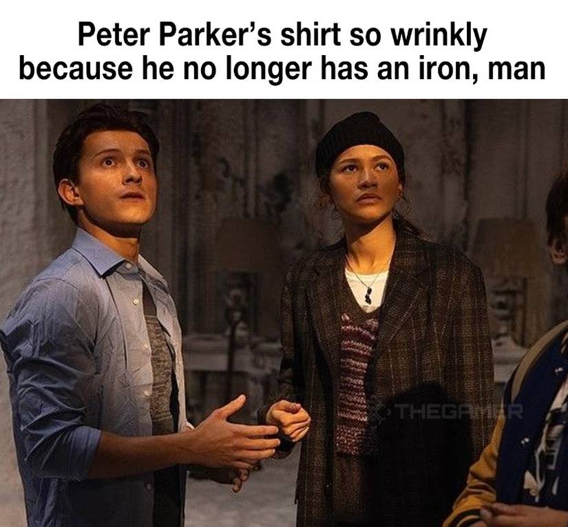 This meme is of top "dad joke" quality and uses poor Peter Parker 's wrinkled shirt as the basis for its humor. While this is hilariously funny, it also just reminds us that Iron Man is gone in the MCU, and every time we remember that fact, it just punches us in the heart all over again. Of course, one of the few people who feel this loss more than most is Peter Parker, evident from his lack of ironed clothing, apparently. However, with the concept of multiverses appearing in the MCU, who's to say we won't get a different Iron Man in the future? 9