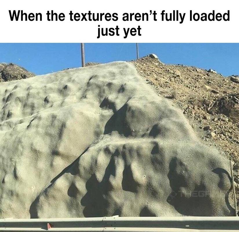 This meme is a photo of a gravel pit where some of the gravel or sand appears to have been watered down to create a smooth effect. It's hard not to look at it and be reminded of a game before its textures fully load. A perfect replica of those moments in games when everything around you looks smooth and lacking in detail before the textures suddenly pop into place.