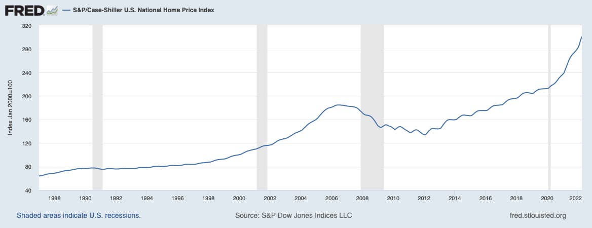 S\&P Dow Jones Indices LLC, S\&P/Case-Shiller U.S. National Home Price Index \[CSUSHPINSA\], retrieved from FRED, Federal Reserve Bank of St. Louis; https://fred.stlouisfed.org/series/CSUSHPINSA, July 5, 2022.