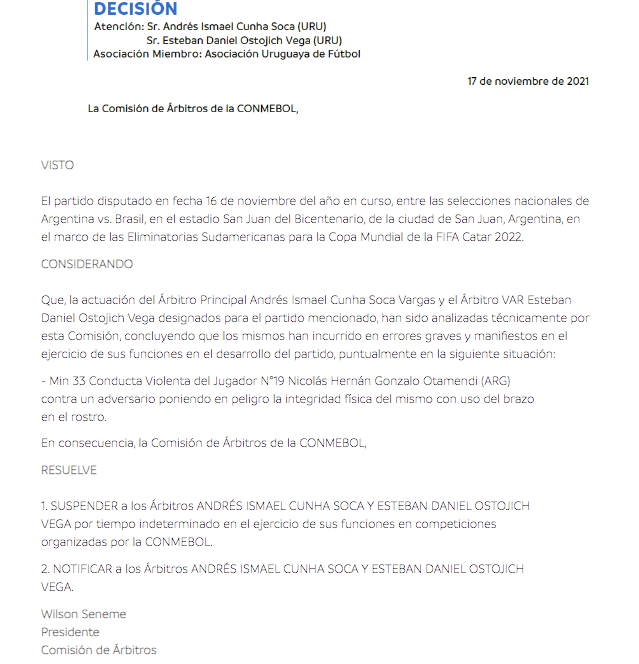 El comunicado de la Comisión de Árbitros de la Conmebol reza en su parte más importante: "La actuación del árbitro principal Andrés Cunha y el árbitro VAR Esteban Ostojich, designados para el partido mencionado han sido analizadas técnicamente por esta comisión, concluyendo que los mismos han incurrido en errores graves y manifiestos en el ejercicio de sus funciones en el desarrollo del partido, puntualmente en la siguiente situación: Conducta violenta del jugador número 19, Nicolás Otamendi, contra un adversario poniendo en peligro la integridad física del mismo con uso del brazo en el rostro".